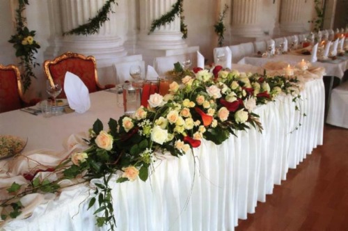 Стойки с живыми цветами, разнообразные вазы, букеты на столы, букет для невесты, ладья из живых цветов, оформление зала живыми цветами на свадьбу, свадебная флористика.
