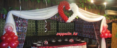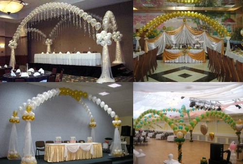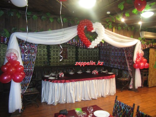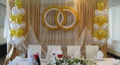 Для оформление президиума возможно сделать выбор среди таких композиции как свадебные сердца из воздушных шаров, свадебные кольца из воздушных шаров, лебеди из воздушных шаров, гелиевые арки, обычные арки из воздушных шариков, композиции с надписями на воздушных шарах, панно из шаров.