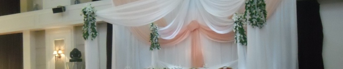Оформление зала на свадьбу, драпировка тканью, композиции из живых цветов, и другими декоративными материалами.